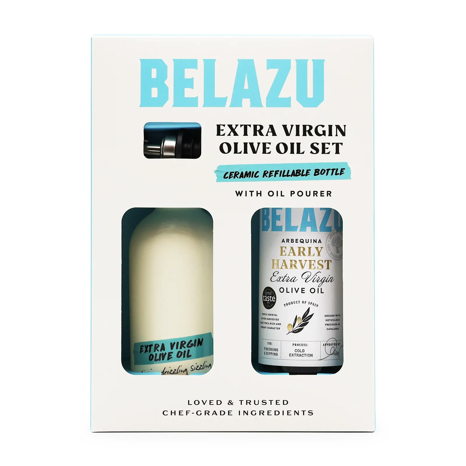 A sophisticated and functional addition to any kitchen or table, this elegant gift set showcases the exceptional quality of Belazu’s Early Harvest Extra Virgin Olive Oil, paired with a beautifully crafted ceramic refillable bottle and stainless steel pourer. Belazu Early Harvest Extra Virgin Olive Oil (500g): Cold-pressed from green Koroneiki olives picked early in the season, this oil is vibrant, grassy, and peppery – ideal for drizzling over salads, grilled vegetables, or fresh bread. Ceramic Refillable Bottle with Oil Pourer: A stylish and practical kitchen essential. The ceramic bottle protects your olive oil from light to maintain its quality, while the sleek pourer allows for controlled, mess-free drizzling. Designed to be refilled and reused, it’s both sustainable and beautiful. Perfect as a gourmet gift or a pantry upgrade for passionate home cooks and entertainers.