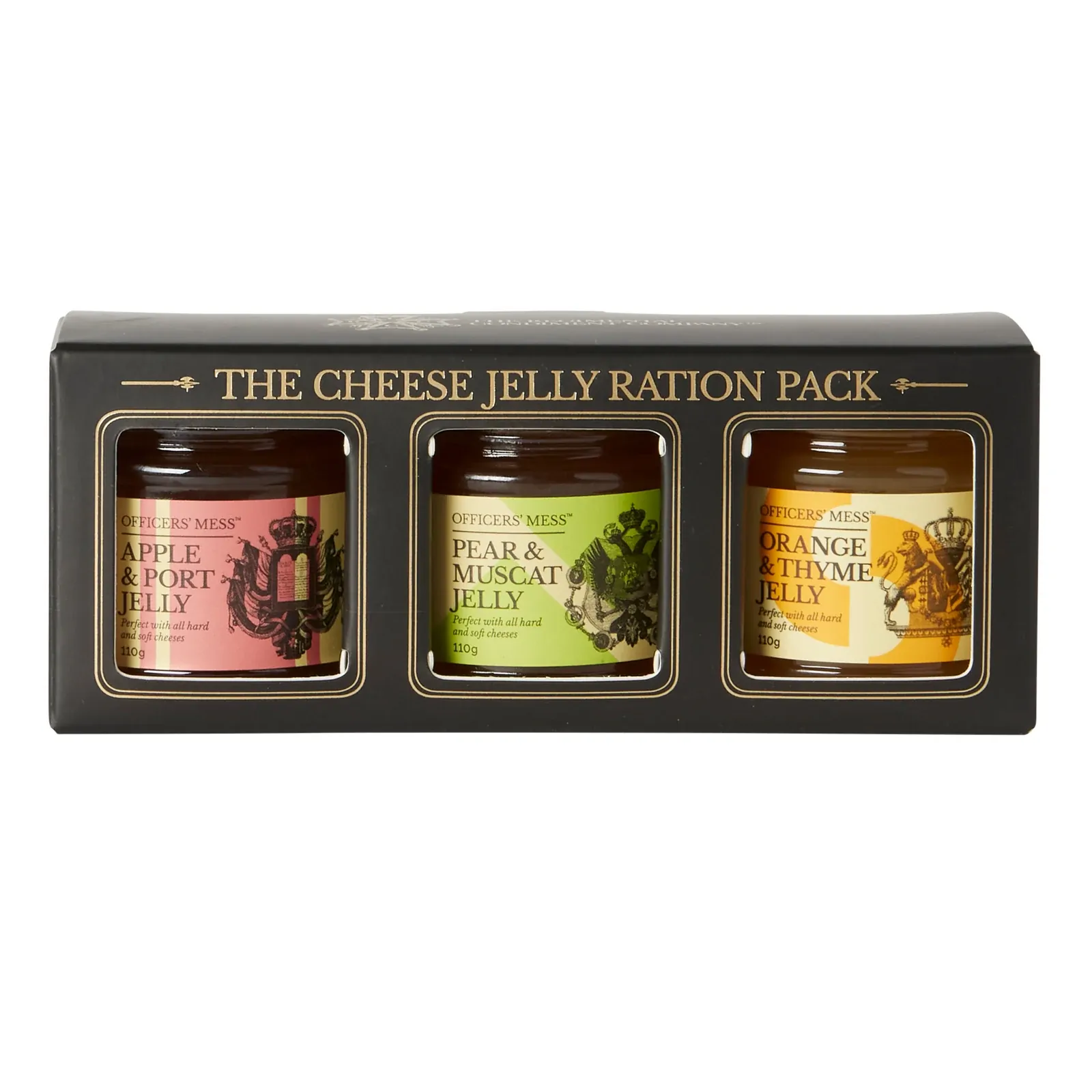 These eye catching gift packs from The Regimental Condiment Company emanate from the glory days of the Officers' Mess. The Cheese Jelly Ration Pack includes the Officers Mess Orange & Thyme Cheese Jelly, Officers Mess Pear & Muscat Cheese Jelly and the Officers Mess Apple & Port Jelly.
